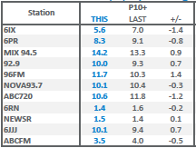 In the FM market, Mix remains on top in breakfast, with show The Bunch on 14% share ahead of Nova93.7 on 10.9%, Today Network’s 9.5% share, up a solid 1 share point from 8.5% for third place. In fourth place is 96FM on 9.1%, down from 9.5%.
