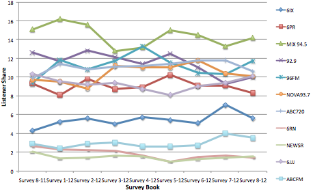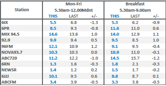 ABC720 remains the overall breakfast winner however despite a drop of 1.2 share points. The station stands on 14.5%, down from 15.7%.