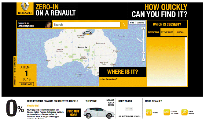 The campaign will centre around a digital game called Zero In in which consumers attempt to guess the location of a Renault Megane Hatch Diesel on a map of Australia.