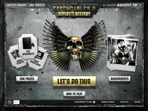 The Expendables 2: Deploy & Destroy was created by Soap Creative. Prizes within the game allows users to win a Play Station 3, tickets to the film and game downloads to be won.