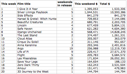 Meanwhile Silver Linings Playbook saw a resurgence for distributor Roadshow following the Oscars, taking $1.044m across 243 screens for a $4,298 average. The film is in its fifth weekend moved from third last week to second this week.