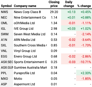 Among the broadcasters, ARN Media had a bad day, losing 3.64%, and Sports Enertainment Group had a worse one, losing 10.71%.
