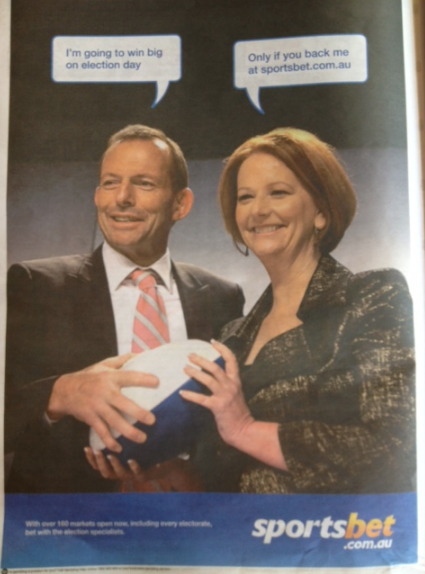 In the ad, speech bubbles emerge from the two main election hopefuls. Liberal Party leader Tony Abbott says, “I’m going to win big on election day”; Prime Minister Julia Gillard counters, “Only if you back me at sportsbet.com.au”.