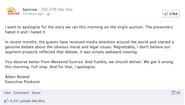 The Sunrise Facebook page was flooded with accusations that the segment endorsed the idea of virgin auctions as well as a documentary on the website.