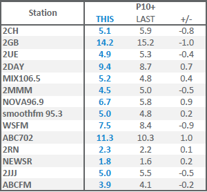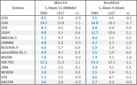 Breakfast set up the networks across the Monday to Sunday ratings, with 2GB in front across the city with 14.2%, despite a drop from 15.2% while Southern Cross Austereo’s 2Day network is winning commercial FM up from 8.7% to 9.4%, followed by WSFM on 7.5% down from 8.4% with Nova96.9 closing the gap going up from 5.8% to 6.7%.