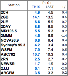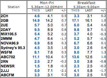 The station took big hits in the 18-24 demo, dropping from 7.0% to 3.6%, while the 35-39 demo dropped from a strong 11.4% to 9.8%, but held on to third spot due to a big drop by ABC’s Triple J, from 16.0% to 9.4%.