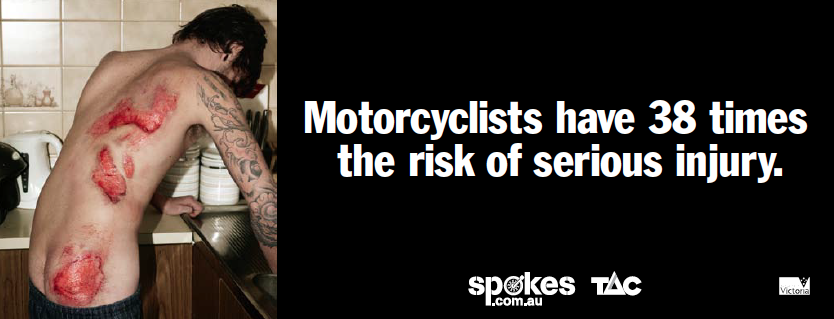 To answer Rob, despite all the arguments that riders know they will be injured in an accident, etc, people seem to be offended with the suggestion that some of our fellow riders are dickheads and consequently don’t think enough about the risks when doing dickhead things. So generally knowing you will be hurt and being conscious of this when riding and not act irresponsibly at the time do not always align (I witness stupid riding or high risk riding every second day – the girl in short skirt and singlet who wizzed past on the SV650 yesterday had me shaking my head). Hence the TAC approach.
