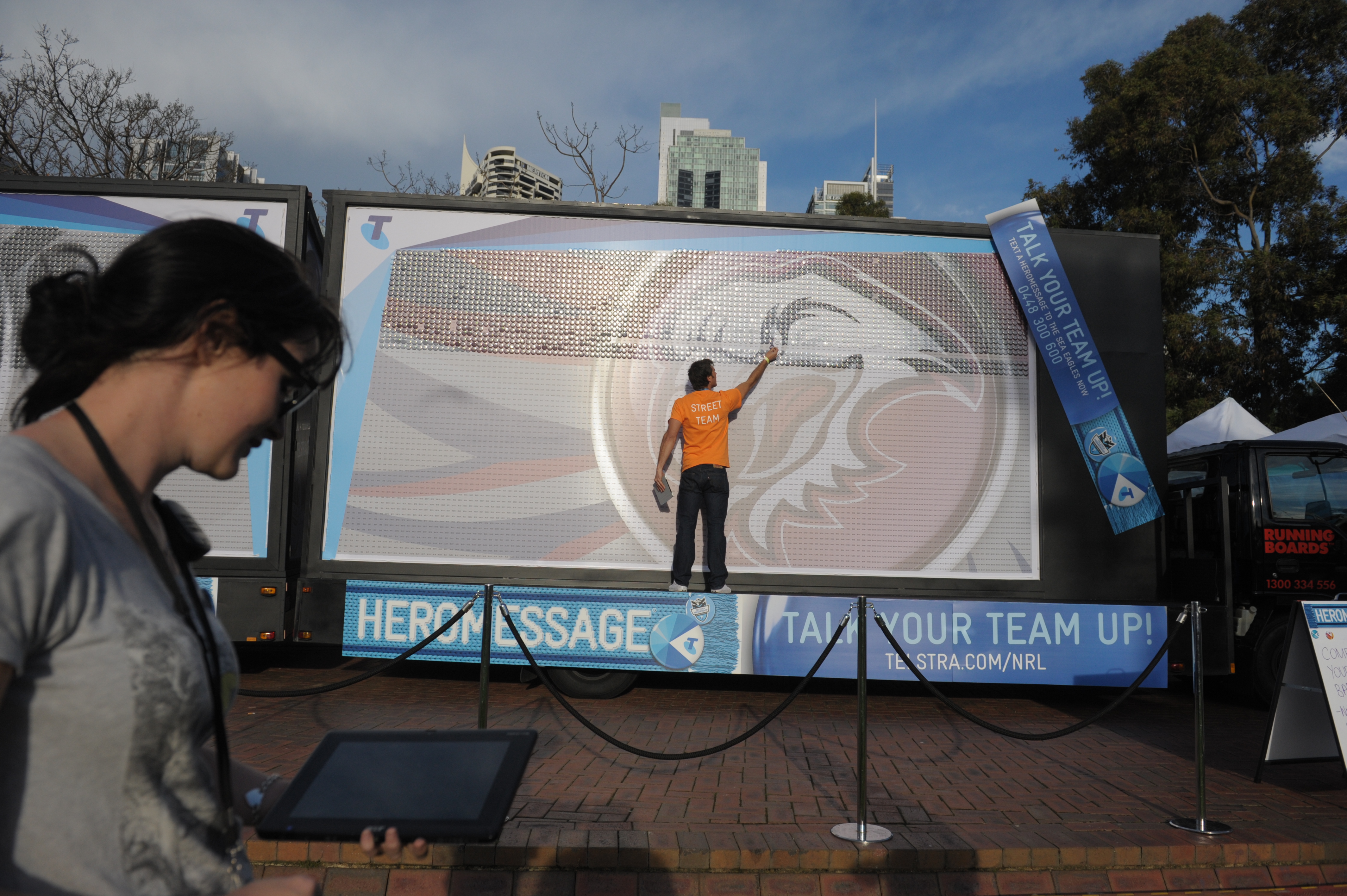 As part of its sponsorship campaign for the run up to the NRL footy finals on Sunday, Telstra is using mobile billboards to carry messages of support from Warrior and Sea Eagle fans via the website, Telstra.com/nrl.
