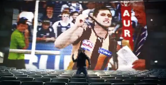 The AFL has used him before, and he is well known as a passionate football supporter in Melbourne (Go the Kanags!!). I think it does work, because the fact he is a ‘celebrity’ isn’t the point, but someone that gets excited by footy in September.