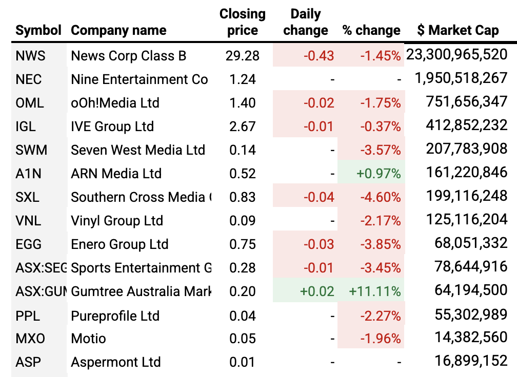 Elsewhere on the Unmade Index, SCA stocks lost 4.6%, taking the company back below a $200m market cap while merger partner Seven West Media lost 3.6%, dropping it to a $208m market cap.