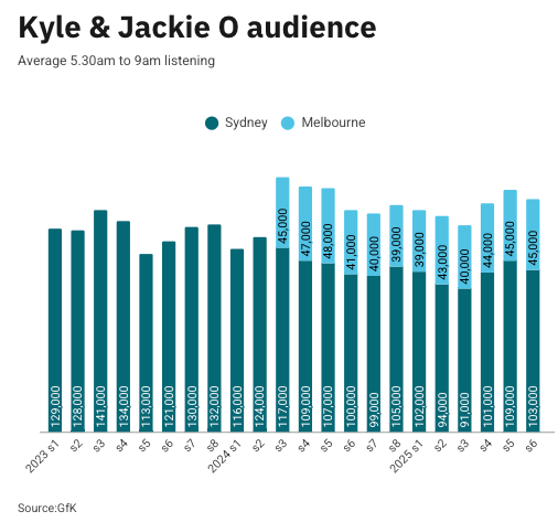 If ARN was looking for more information on progress of Kiis FM’s The Kyle & Jackie O Show ahead of extending the networking beyond Sydney and Melbourne, today’s numbers didn’t particularly help. The average number of Sydney listeners dipped a little while Melbourne stood still. A third survey running with growth would have created more confidence.