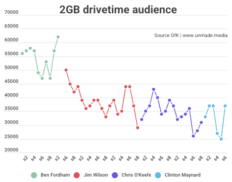 And 2GB’s shows all improved. The morning slot was up 3.4 ratings points, afternoons were up by 1.6 and in drive, Clinton Maynard was up by 2.6 points.