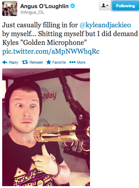 As O’Loughlin put it on Twitter, in what appears to have been the only communication from the network about the affair: “Just casually filling in for @kyleandjackieo by myself… Shitting myself but I did demand Kyles “Golden Microphone”:”