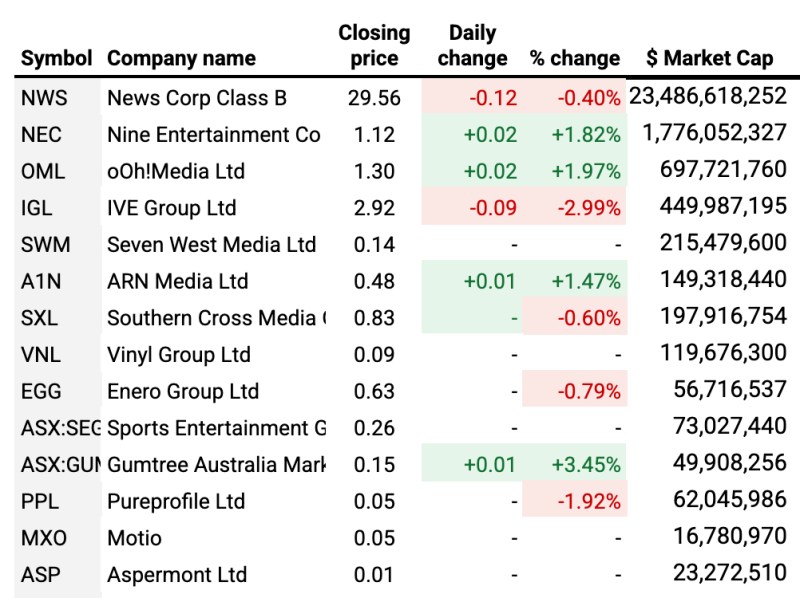 Gumtree was also up (+3.45%) while the fallers were Ive (-2.82%), Seven West Media (-3.57%), Pureprofile (-1.92%), Southern Cross (-0.60%), and Enero (-0.79%).