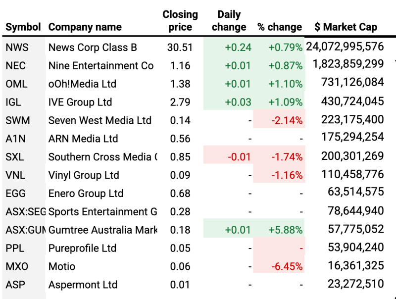 Nine (up 0.9%), Ooh Media (up 1.1%), Ive Group (also up 1.1%) and Gumtree (up 5.9%) were among the stocks that improved today, while merging media companies Seven West Media (down 2.1%) and Southern Cross Austereo (down 1.7%) both lost ground. Vinyl Group was also down, by 1.2%.