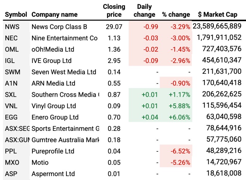 Of the gains, Enero stood out with +6.06% and Vinyl at +5.88%. A search of the ASX announcements page does not reveal any obvious reason for the positive swing for these stocks, but as noted here before, Vinyl is no stranger to volatility. A small increase for Southern Cross Austereo (+1.17%) may be further adjustment following its movements in the wake of this week’s news that the independent advisor Kroll had given its proposed merger with Seven West Media the green light.