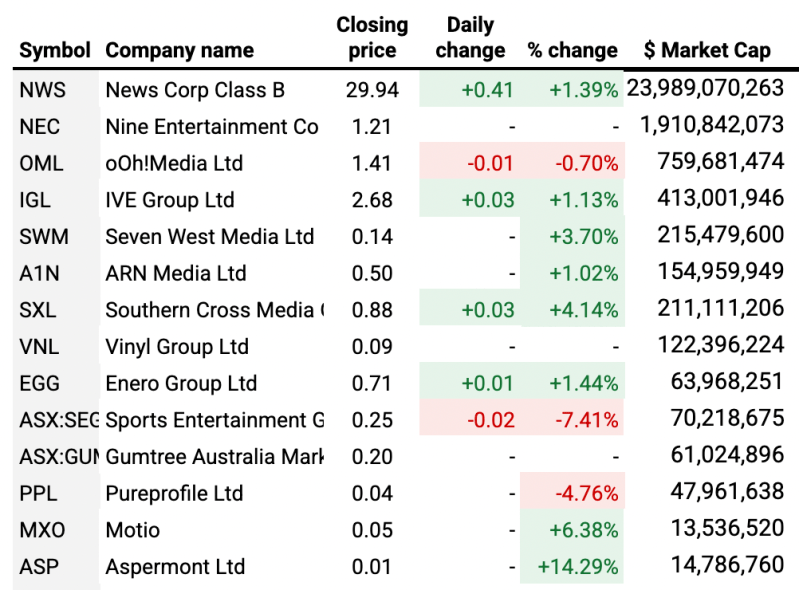 Ooh Media was also slightly into negative territory, losing 0.7%.