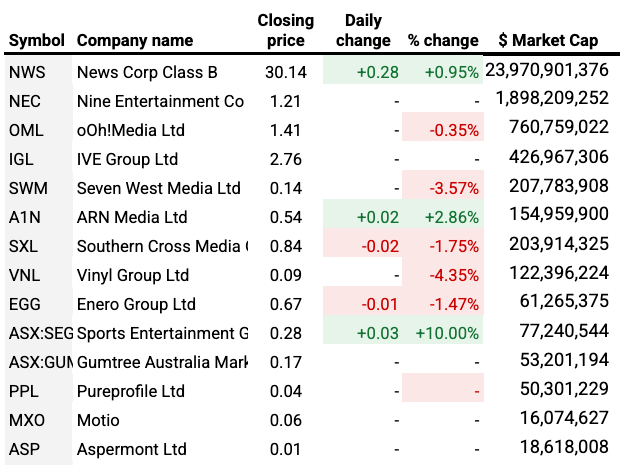 It was also a negative day for Seven West Media (down 3.6%), Ooh Media (down 0.4%) and Enero (down 1.5%).