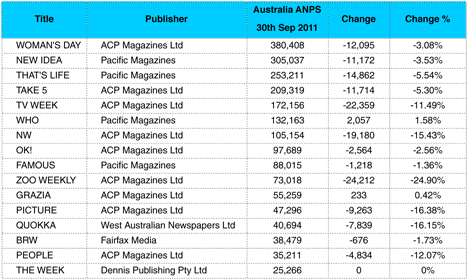 ACP’s Picture and NW magazines, and West Australian Newspapers’ Quokka, also suffered heavy falls, all down more than 15%.