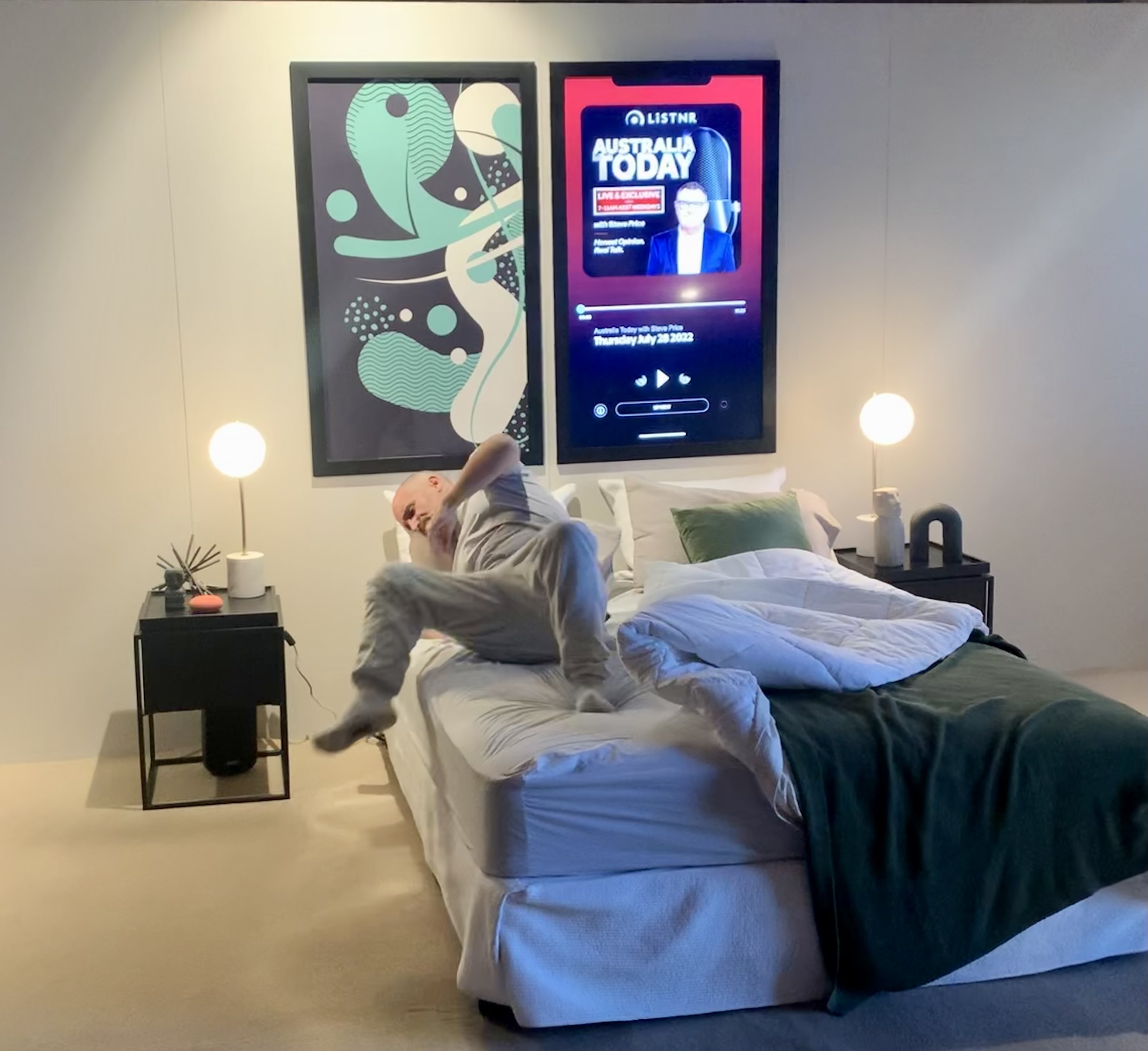 Rather like News Corp’s Come Together upfront a few years back, actors portrayed consumers going through their daily routines, consuming Listnr’s products