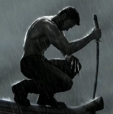 The image is of Wolverine on a traditional Japanese roof overlooking a city with animated rain falling on the Marvel character and lightning flashing in the background.