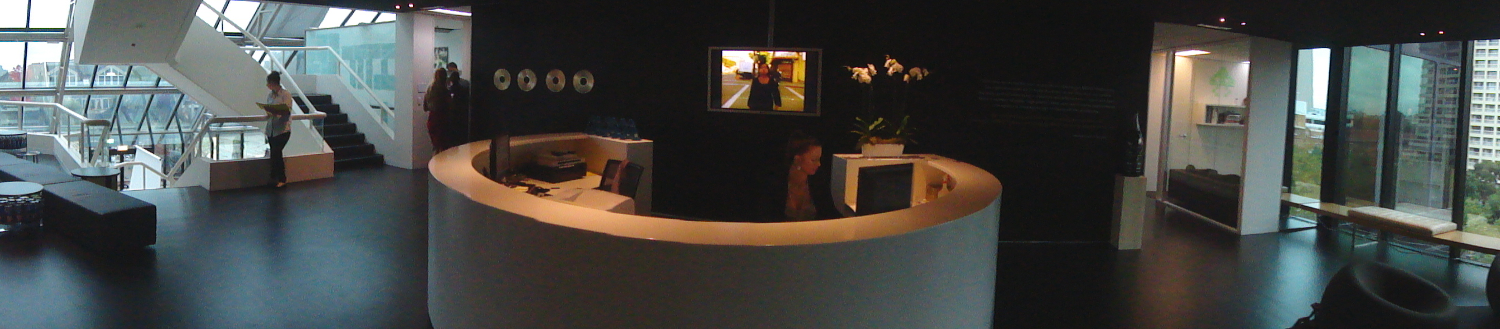 Two very helpful but intimidatingly good-looking receptionists – one guy, one girl – are cocooned in a perfectly round reception desk. People are darting about in corridors, pointing, running up and down stairs, emerging from lifts, swapping things, looking busy.