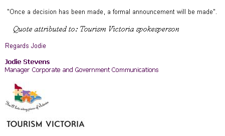 Tourism Victoria is proving to be particularly unhelpful about its ad agency tender, which has more than a few agencies on tenterhooks, and many others wondering why the government agency hasn’t bothered to answer even the simplest of enquiries. Such as when a result might be expected.
