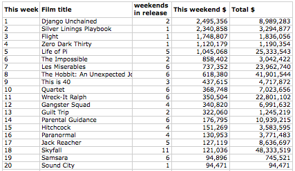 However, Django Unchained made $2.495m in its second weekend. Across 327 screens, the film made $7,631 per screen. The film now stands at $8.989m since opening.
